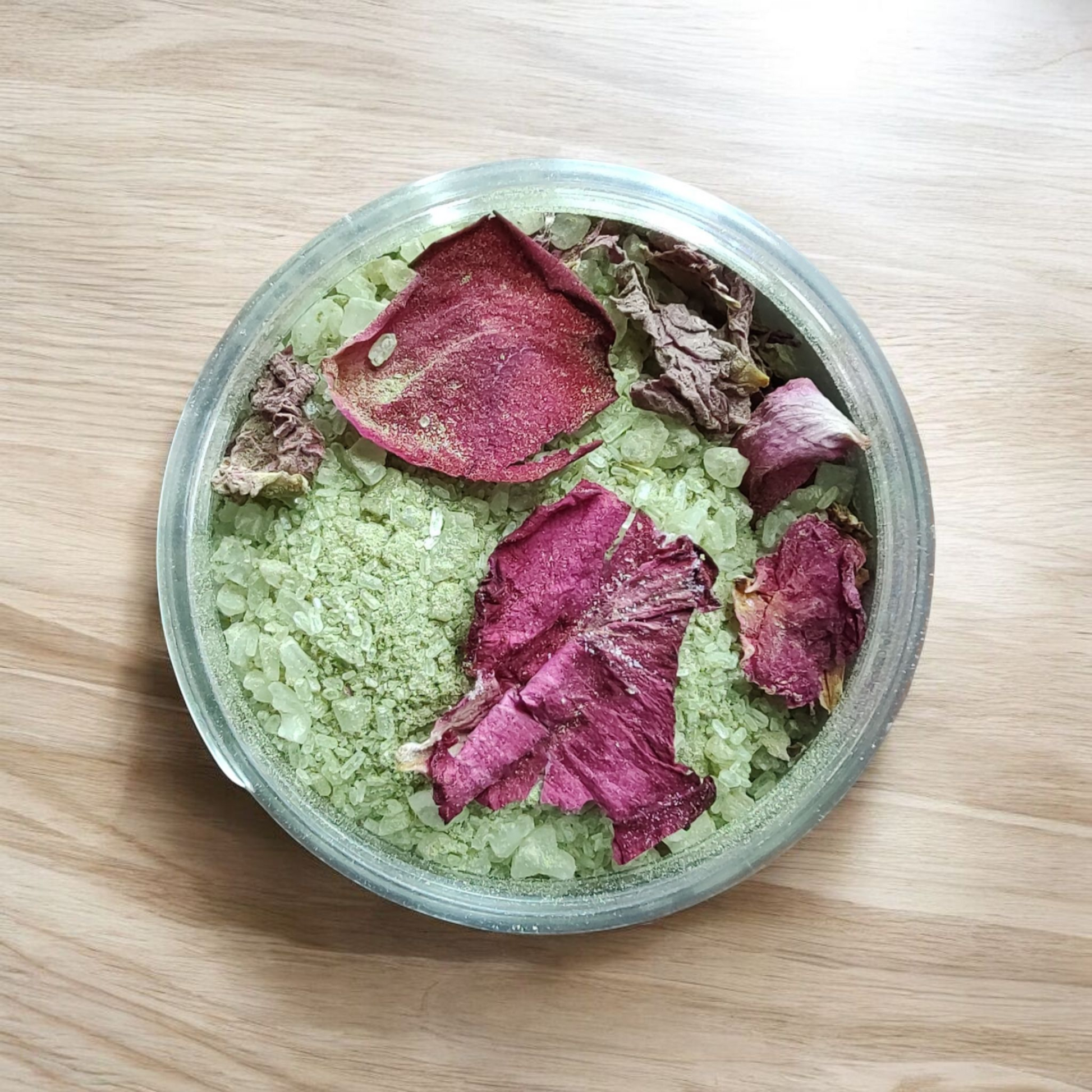INGREDIENTS: Magnesium Sulfate U.S.P (Epsom Salt), Sodium Chloride (Sea Salt), Sodium Bicarbonate (Baking Soda), Proprietary blend of pure essential oil fragrance, Violet flowers, Rose petals, Helichrysum flowers, Matcha.
